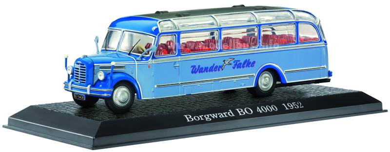 Die im letzten Jahr angekündigte Sammelserie der Atlas Edition ist gestartet: Im Internet kann man auf der Website der Editions Atlas ein Modell des Borgward BO 4000 im Maßstab 1/72 bestellen. Das fein gravierte, detaillierte und gut bedruckte Modell gibt es ohne weitere Kaufverpflichtung zum einem unschlagbaren Preis. Zusätzlich zum Modell gibt es eine 6-seitige Dokumentation mit Fotos und Entstehungsgeschichte des Originals. Außerdem gibt es für Schnellentschlossene ein Poster mit historischen Linien- und Reisebussen. Dieses Poster sollte man sich ganz genau anschauen, denn wer den Verlag kennt, der weiß, dass weitere Modellbusse folgen werden. Und bei der jetzt vorgelegten Qualität des Borgward-Modells kann sich der Modellbus-Sammler mehr als freuen. All zu viel wollte man bei Editions Atlas dennoch nicht verraten, nach dem Borgward wird ein Henschel HS 100 N folgen. In der Produktion sind auch schon ein Saurer L4C, Büssing D2 U, Mercedes-Benz O 3500, Van Hool 306 und ein Magirus Saturn II - M 150 R 12. Wer im letzten Jahr auf den Flyer geantwortet hat und einen Setra S8 sein eigen nennt, der wird automatisch von Editions Atlas angeschrieben und mit dem nächsten Modellbus, einem Henschel HS 100N, beliefert. |