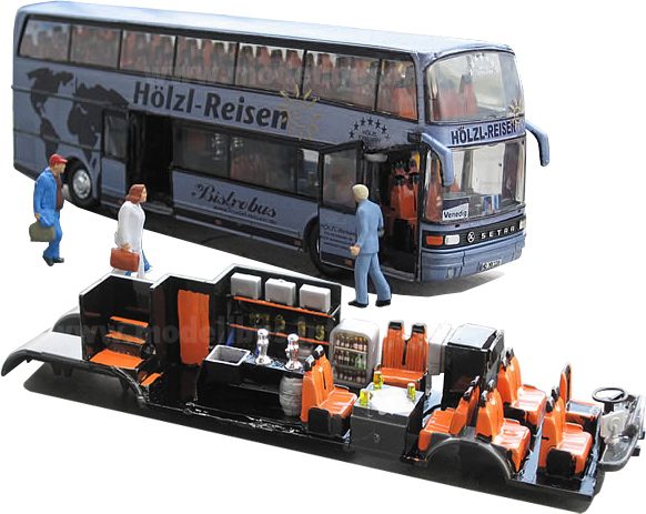 Markus Hölzl hat sich Lkw- und Bus-Modellen im Maßstab 1/87 verschrieben. Der leidenschaftliche Busfahrer ist europaweit unterwegs und hat vor fünf Jahren begonnen, Modellbusse vorbildgerecht nachzubauen. Kurze Zeit später kam er auf die Idee, mit Hölzl-Reisen ein eigenes Busunternehmen zu gründen – natürlich im Maßstab 1/87. Der Fuhrpark umfasst heute zwölf Reise- und einem Linienbus, das Markenzeichen der lachenden Sonne ist auf allen Fahrzeugen vertreten. Der legendäre Setra S 228 DT ist im Fuhrpark mit Abstand der älteste Bus. Im Jahr 2009 wurde der unverwüstliche Doppeldecker aus der Insolvenzmasse eines anderen Busunternehmens erworben und nach den Vorstellungen des Firmenchefs zum Bistrobus umgebaut: Wie ein Blick ins Innere verrät, muss sich diese Ausstattungsvariante nicht hinter denen von Setra ab Werk gelieferten verstecken. Im Oberdeck gibt es 56 Komfort-Ledersitze, so dass spätestens jetzt deutlich wird, warum die Geschäfte bei Hölzl-Reisen so gut laufen. Dies hat auch die AIDA-Reederei erkannt, die zwei Setra S 431 DT nutzt, um die Gäste europaweit komfortabel zu den Häfen der Kreuzfahrtschiffe bringen zu lassen. Dafür wurden bei Hölzl im Januar und Februar zwei neue Doppeldecker mit großer Küche, 66 Sitzen und 5**** Sitzabstand in Dienst gestellt. Ein Doppeldecker hat eine Volllackierung mit einem der Traumschiffe erhalten. Die Omnibusse werden in Handarbeit auf ein einheitliches Firmendesign gebracht, hierzu nutzt Markus Hölzl unterschiedlichste Decals, die er selbst am Computer anfertigt und bei einer Decalprint ausdrucken lässt. Seit Anfang des Jahres ist Hölzl-Reisen auch mit einer eigenen Website online, auf der der gesamte Fuhrpark mit zahlreichen Bildern zu sehen ist. |