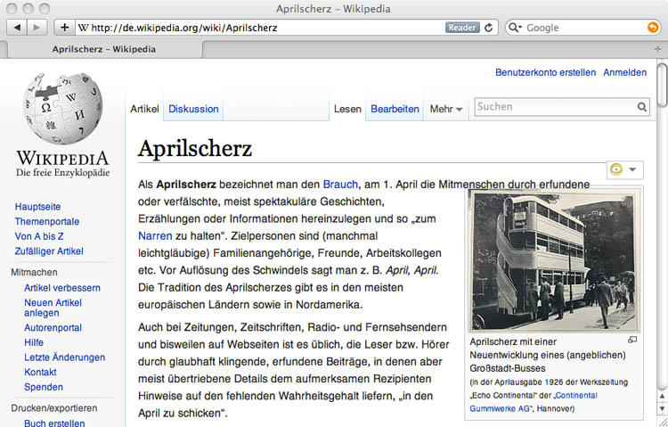 Aprilscherze in der Busbranche sind beliebt: Besonders eine Nachricht sorgte für Aufsehen: MeinFernbus FlixBus übernimmt die Mehrheit der DB! Die Steilvorlage für den Aprilscherz von modellbus.info lieferte der Hersteller selbst. In der MAN Bilddatenbank wurde der Neoplan Skyliner in der Rubrik der MAN BusDays als MAN Lions Skyliner gelistet, wie das Screenshot in der gestrigen Meldung belegt. Mittlerweile hat MAN den Fehler korrigiert, der Skyliner gehört wieder zu Neoplan. Wer sich über Aprilscherze informiert, der schaut mitunter bei Wikipedia nach. Hier wird der Interessierte sogar wieder mit dem Thema Bus konfrontiert: Zur Illustration des Textes zum Ursprung, den Beispielen sowie der Literatur zum Aprilscherz nutzt Wikipedia eine Fotomontage der Continental AG, die in der Aprilausgabe der Werkszeitung von 1926 die Neuentwicklung eines Großstadtbusses ankündigt. Und das ist nicht nur ein einfacher Doppeldecker, sondern ein Bus mit gleich drei Stockwerken! Vielen Dank für die vielen eMails in Sachen Aprilscherz – wer das veröffentlichte Foto vom MAN Lions Skyliner ansieht, der erkennt, dass das Foto fünf Tage zuvor in der Meldung zur Weltpremiere des MAN Lions Intercity schon einmal gezeigt wurde – als Neoplan Skyliner! Ein bisschen Spaß muss sein... |