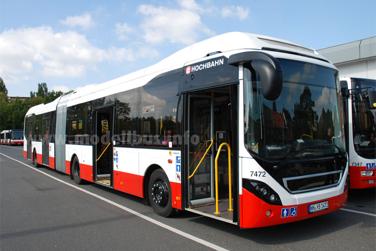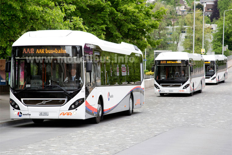 Die 12 m lange Diesel- Hybridbusvariante des Volvo 7900 im Einsatz bei der ÖPNV-Betreibergesellschaft AAR bus+bahn in Aarau (Schweiz) und die 18 m lange Diesel-Hybrid-Gelenkbusvariante des Volvo 7900 im Einsatz bei der Hamburger Hochbahn AG in Hamburg. |