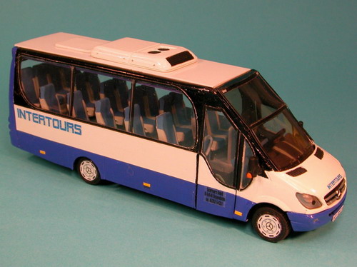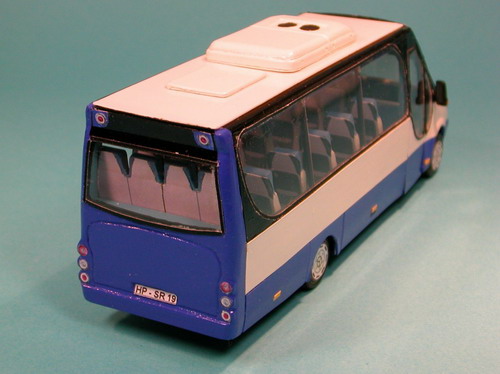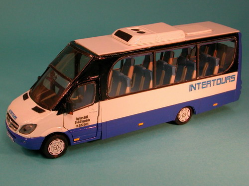 Die Göppel Bus GmbH ist ein mittelständisches Unternehmen, das sich auf die Entwicklung und Klein-Serienproduktion omnibusbasierender Nutzfahrzeuge spezialisiert hat. Als unabhängiger Partner der MAN Truck & Bus GmbH produziert die Göppel Bus GmbH nicht nur Stadtlinien-Midibusse und entwickelt diese weiter, sondern präsentiert sich auch Entwicklungspartner für Prototypen und Fahrzeugsonderlösungen. Der neue auf Sprinter-Fahrgestell basierende Göppel Mini-Reisebus namens Mini4Travel besticht durch sein ansprechendes Design in Kombination mit durchdachter, wirtschaftlicher Funktionalität und gewährt zudem besten Reisekomfort. Dank der langjährigen Erfahrung im konventionellen Busbau entstand ein modernes, stabiles, langlebiges Fahrzeug, das einen bustypischen Gerippeaufbau aufweist. Einzigartig in seiner Klasse bietet der Mini4Travel S mit einem Kofferraumvolumen von insgesamt fast 3 m³ genügend Stauraum für das Gepäck Ihrer Fahrgäste. Großzügig ausgelegt ist der im Heck positionierte Kofferraum. Zudem bieten die beidseitig seitlich am Fahrzeug integrierten Fächer zusätzlich Stauraum. So finden auch sperrige Gegenstände wie Carving-Ski ihre Mitfahrgelegenheit. Ausgangspunkt für den Umbau von Peter van der Reest war wieder einmal ein Siku-Modell. (C) www.modellbus.info / Göppel-Bus GmbH |