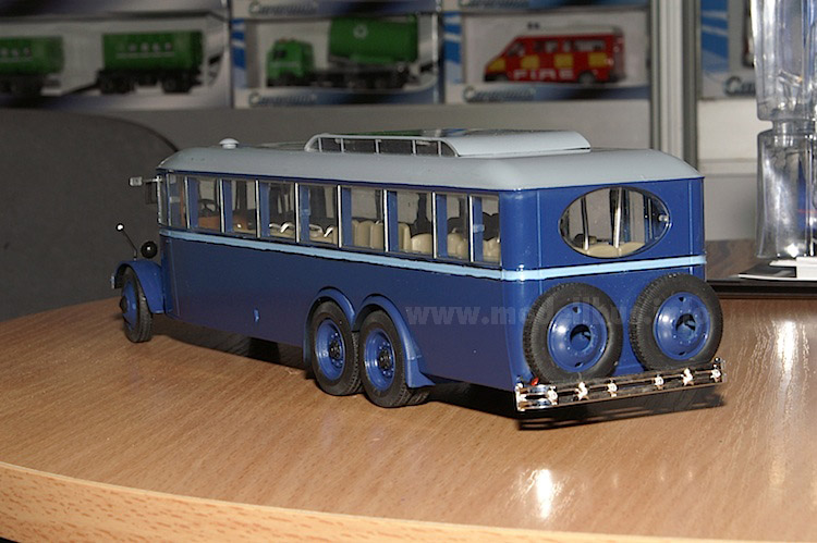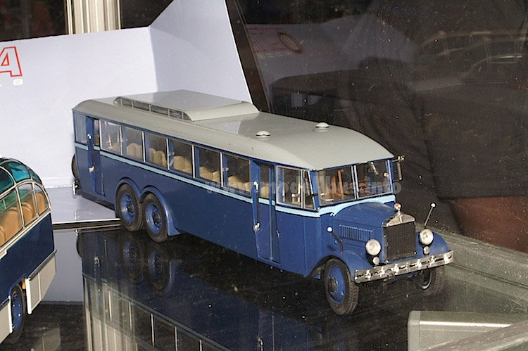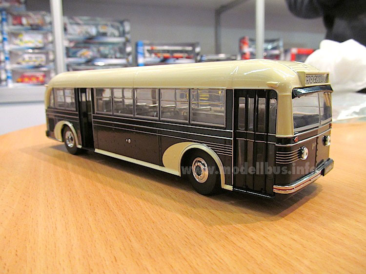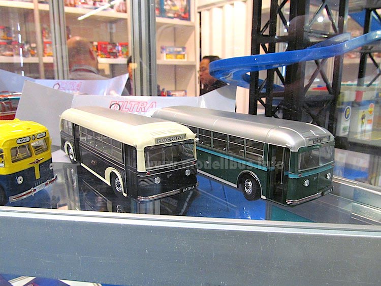 Ein feines, leider auch teueres Kleinserienmodell war in verschiedenen Versionen am Stand von ABC-Brianza zu bewundern: ein Fiat 626 RNL im Maßstab 1/87. Das hell-/dunkelblaue Resinmodell wird nicht nur als Bausatz, sondern auch als Fertigmodell geliefert, wobei die geöffneten Türen, die nicht beweglich sind, dann einen schönen Blick auf die Inneneinrichtung freigeben. Vorbild des gelungenen Modellbusses ist ein knapp acht Meter langer Frontmotor-Bus, der von 1939 bis in die ersten Nachkriegsjahre gebaut worden ist |