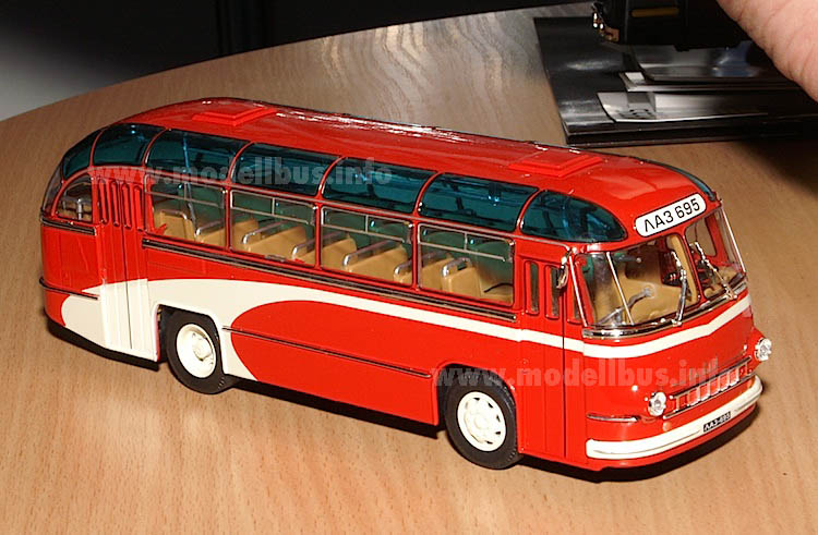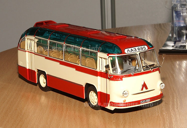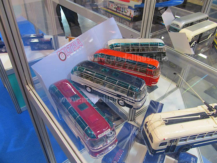 Der russische Hersteller bietet ein umfangreiches Fahrzeugprogramm an, natürlich auch mit einigen Busmodellen: So gibt es in 1/43 einen KAvZ 3976 Haubenbus in diversen Dekorationen sowie einen PAZ Midibus. Ein dreiachsiger 6x6-Lkw der Marke URAL mit Bus-Koffer-Aufbau war in Nürnberg auch zu sehen. Ein spielzeughafter Obus weist einen kleineren Maßstab auf. |